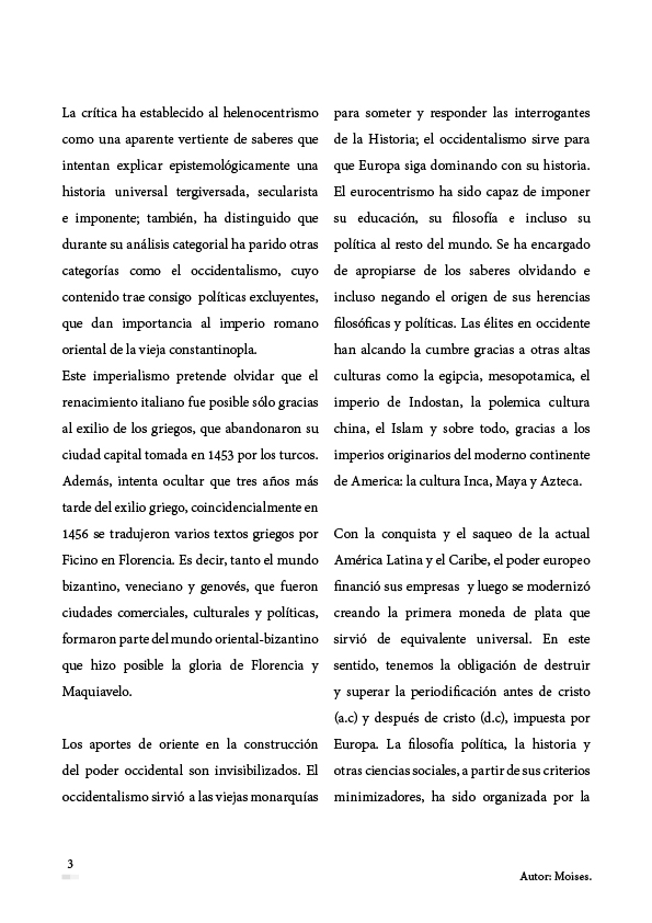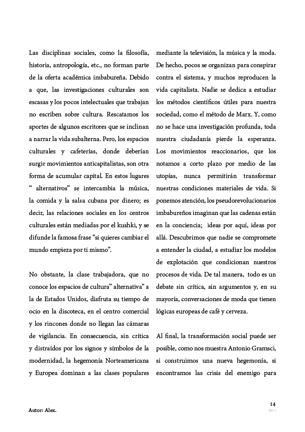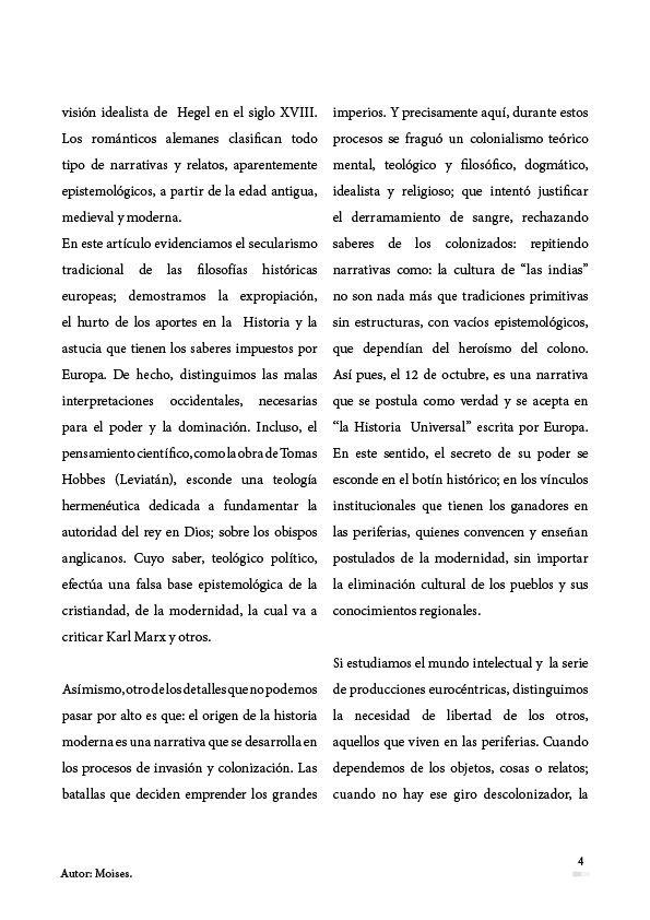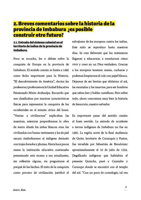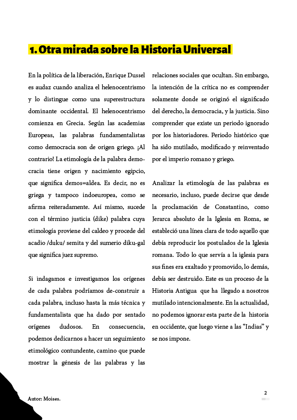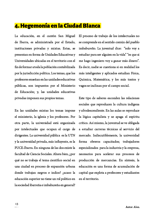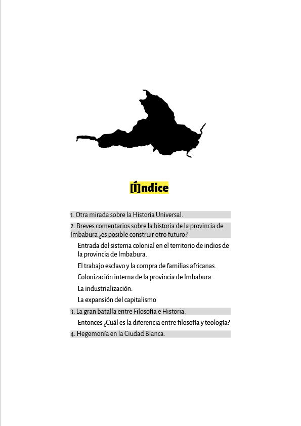 En esta primera edición, se desmonta el mito del origen occidental de la democracia en «Otra mirada sobre la Historia Universal», se rastrean las raíces coloniales del presente imbabureño en «Breves comentarios sobre la historia de la provincia de Imbabura», y se confrontan las falsas neutralidades académicas en «Hegemonía en la Ciudad Blanca». ¿Puede haber educación sin ideología? ¿Puede haber filosofía sin cuerpo y sin territorio?